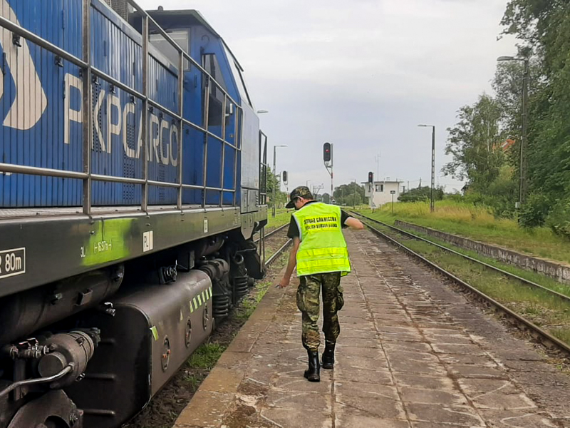 funkcjonariusz Straży Granicznej podczas odprawy pociągu towarowego
